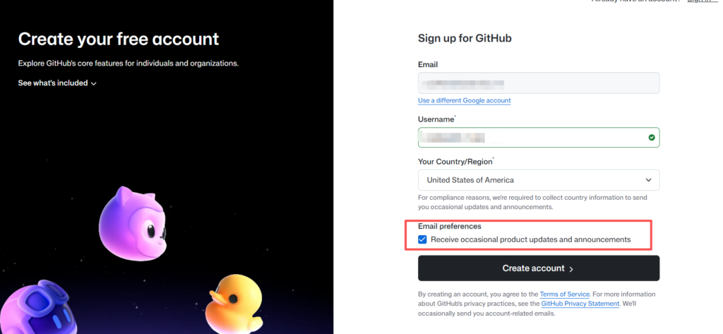 4、勾选服务条款,点击Create account