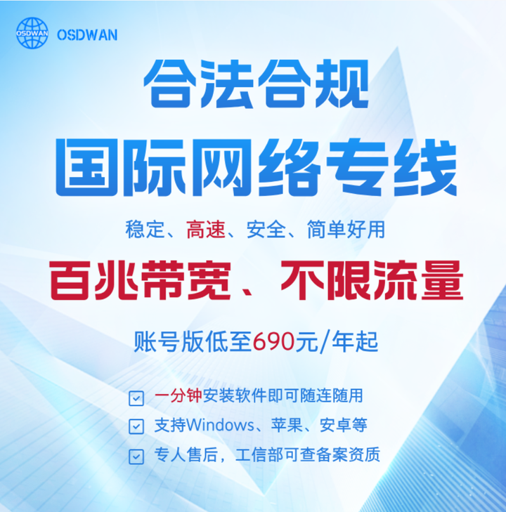 OSDWAN是国内专业跨境网络专线的服务商,是基于SD-WAN技术和SaaS技术的一款产品,支持cpe设备和软件连接,适用于外贸办公、跨境电商、TK直播、社媒运营、AI访问等场景,多设备支持连接,Windows/安卓/苹果等都可以连接使用,可访问国外任何网站,并且企业可基于APP随时管理,比如上网日志审查、加密、终端管理、员工管理等各项操作。