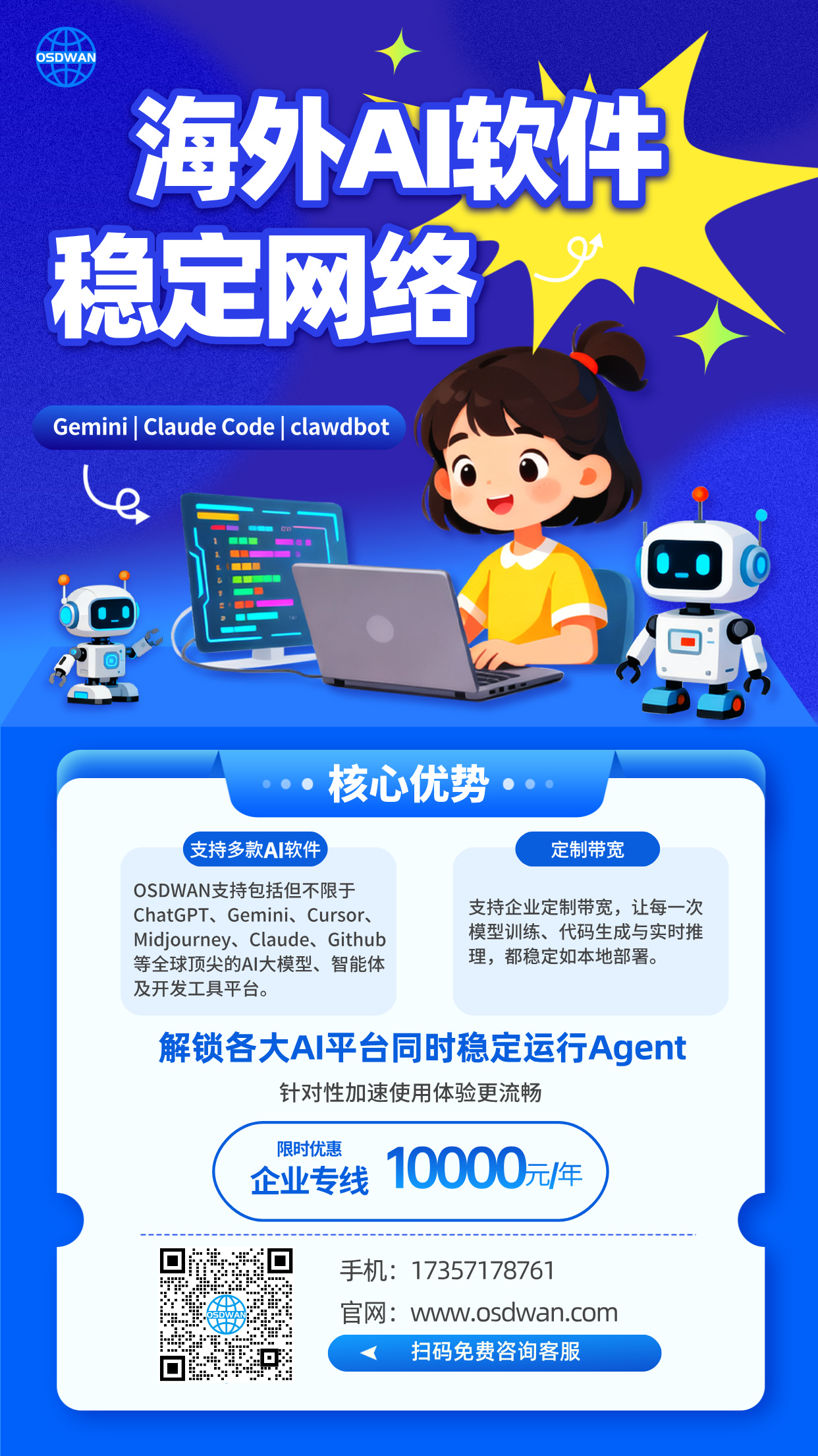 OSDWAN 是国内专业的跨境网络专线服务商,专注为AI开发者与出海企业提供稳定、低延迟的海外网络加速方案。