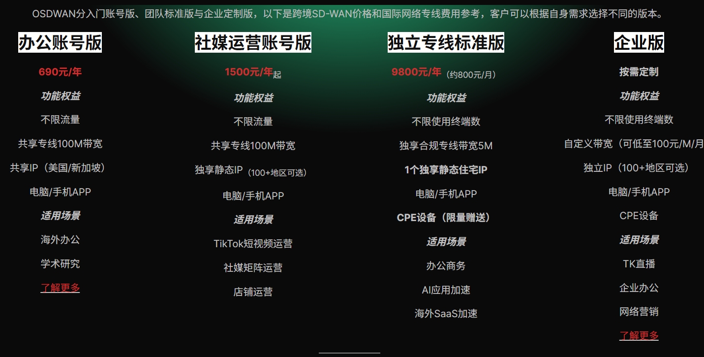 OSDWAN提供不同场景以及版本的价格,分别有入门版、社媒运营账号版、独立专线标准版、企业版等等,其中国际专线版,独享合规专线带宽5M价格在9800元/年,美区线路价格大概在200元/M/月,如需优惠可咨询我们的顾问,还可以申请免费试用!
