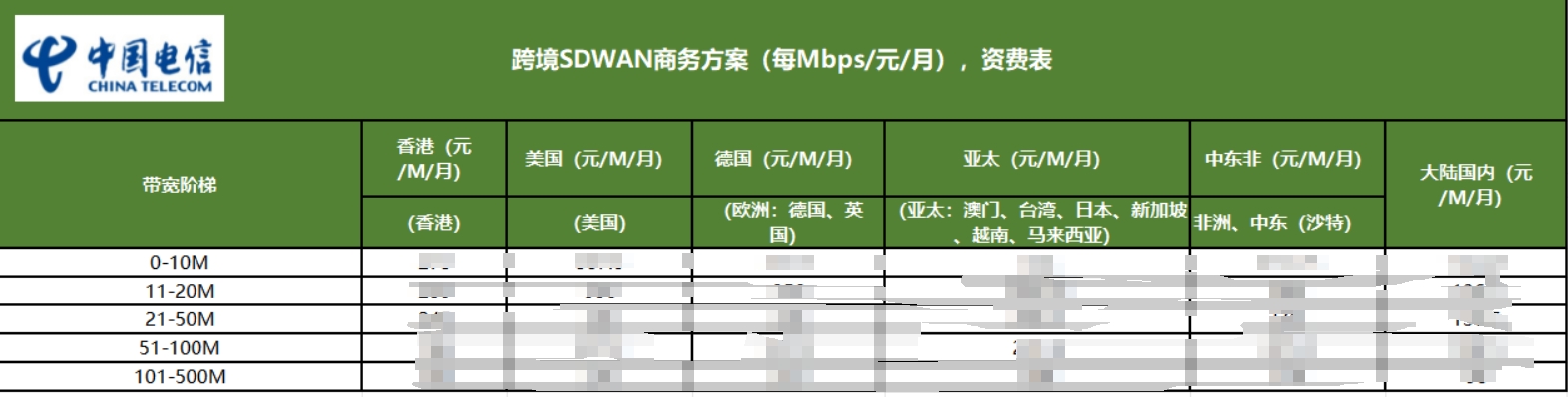 电信国际专线网络根据不同的带宽以及线路来进行收费的,比如香港线路约300元/M/月,美国、德国以及其他地区300-400元/M/月,中东非地区价格更高。