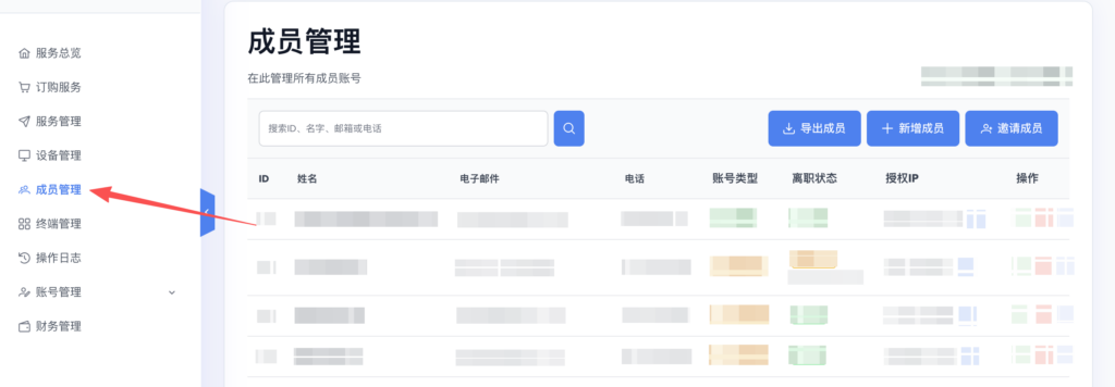 • 服务的授权员工列表 ,可以在此页面 ,快速批量授权给员工账号使用服务。