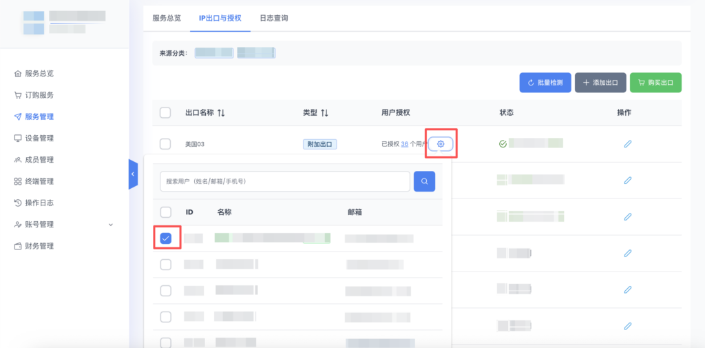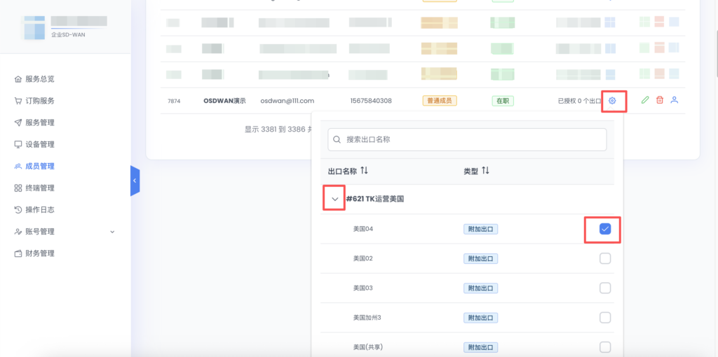 • 点击员工信息的授权图标 ,选择对应服务包含的出口进行远程办公授权。