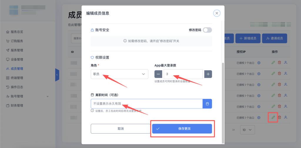 • 点击员工信息的编辑图标 ,进行信息修改。(可以修改密码,限制所能同时登录的设备数以及离职时间)