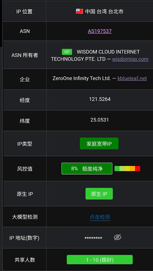 属于最优级住宅IP资源,如台湾本地 ISP 分配给家庭用户的宽带IP段;